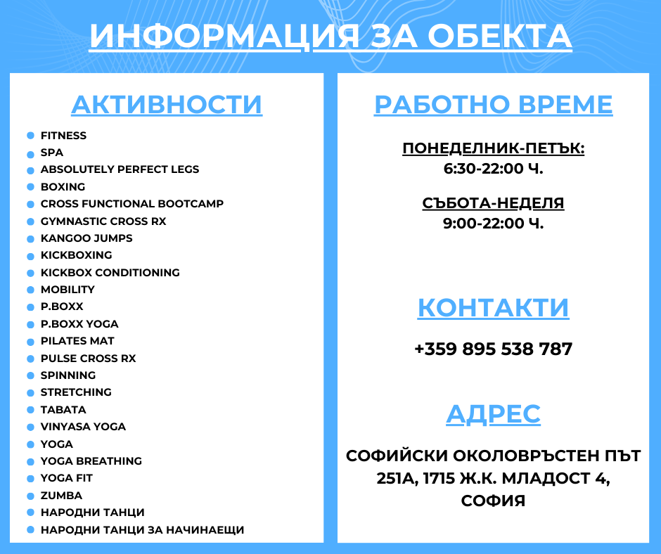 Обектът радва жителите на квартала със своите 5500 квадратни метра площ, 5 етажа, над 250 паркоместа, 2 зали за групови занимания, 5D спининг студио, протеинов бар, магазин за спортни дрехи и аксесоари, огромна спа зона и уреди, произведени от най-добрите брандове във фитнес индустрията. Обектът разполага с храна на място Pulse Food, масажно студио и солариум.Независимо дали Вашата цел е релакс за ума и съзнанието Ви, или се стремите към по-добра кондиция за Вашето тяло, Pulse Mladost ще отговори на всички Ваши нужди и то по един блестящ начин.
