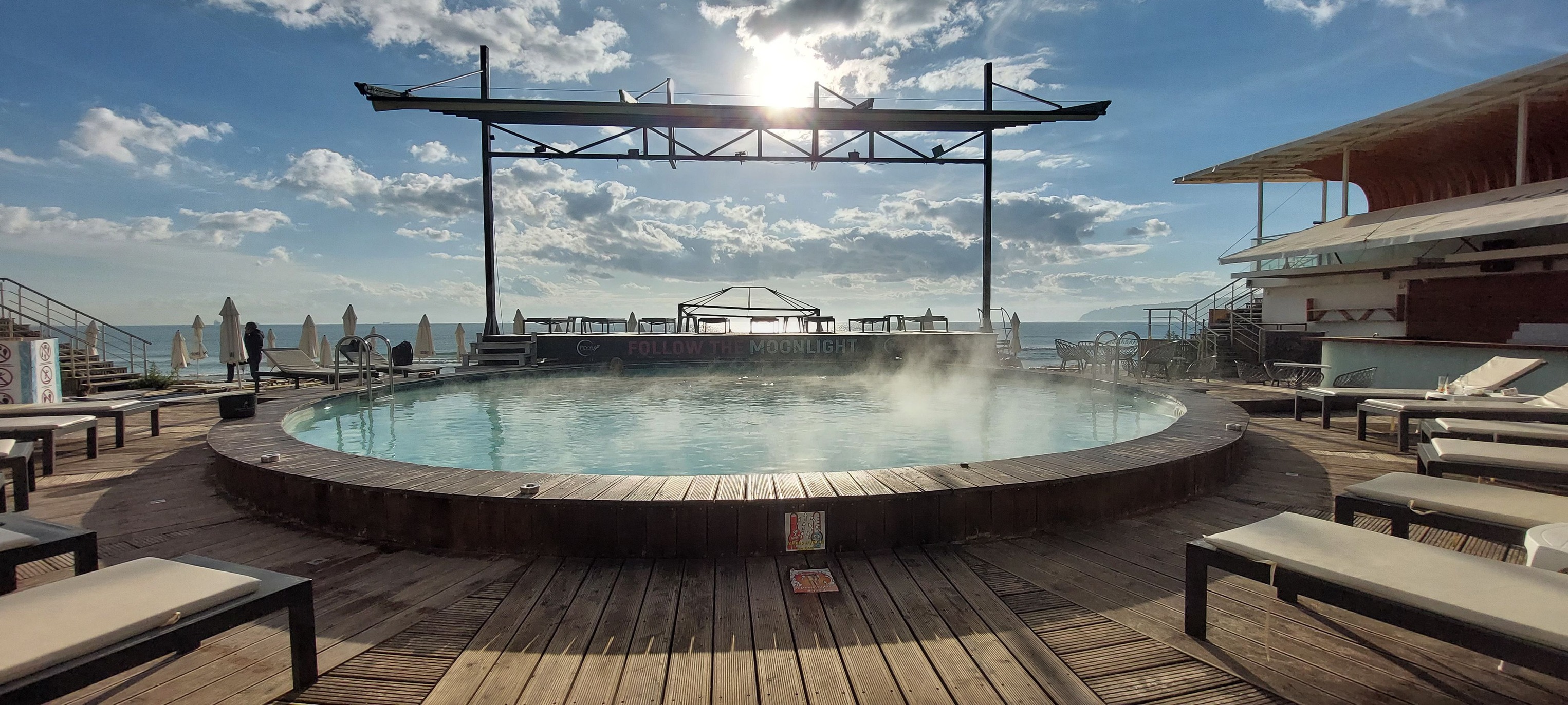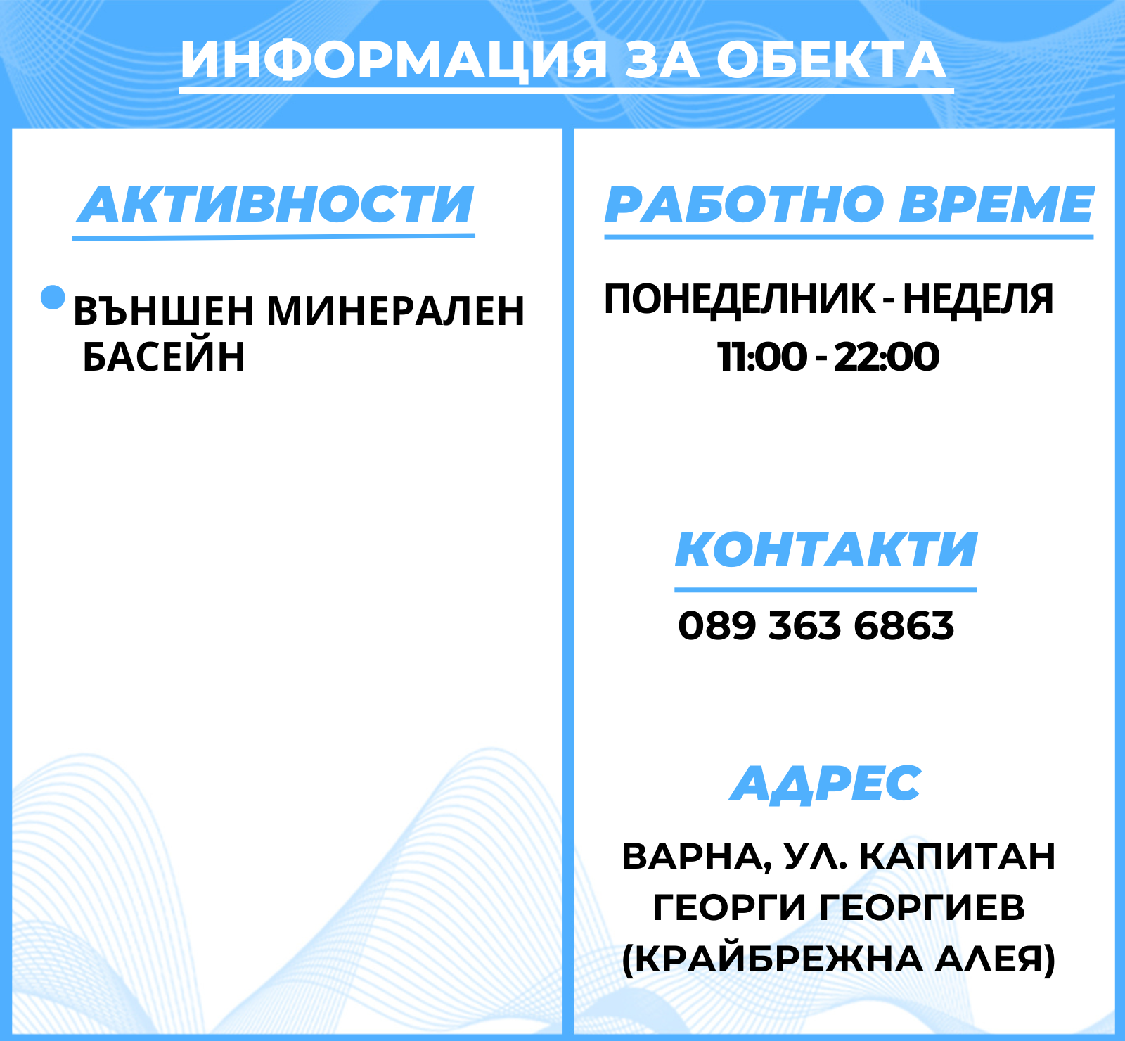 Външен термален басейн е с минерална вода. Температурата е 38-40 градуса. Дълбочината му е 1.50м. С CoolFit може да ползвате и шезлонг, душ, съблекалня.