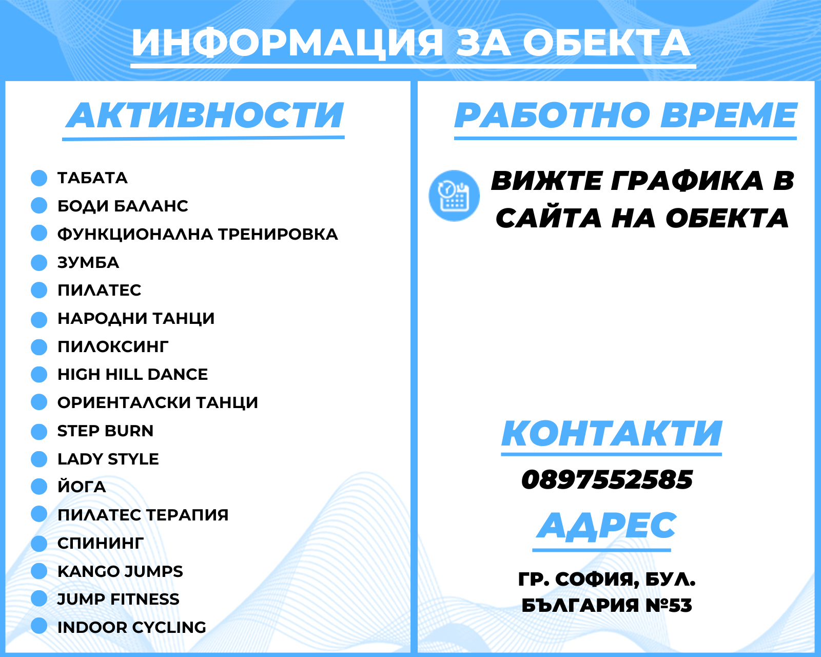 Dance and Sport Center Your Spirit разполага с три зали в една локация, изцяло оборудвани за всякакви групови занимания, спортни събития и всички удобства за всеки наш посетител. Централна вентилация, климатици, съблекални, душове и зона за отдих. Свободна зона за паркиране и паркинг в близост до обекта.